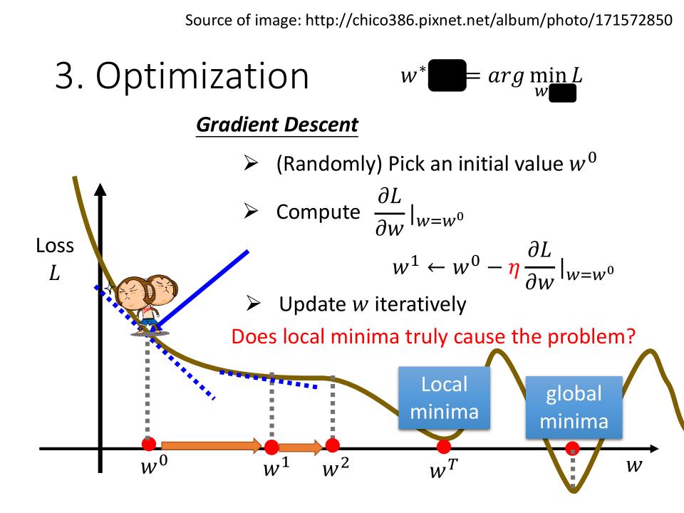- 这个过程用的数学表达式是:$ w^1 \leftarrow w^0 - {\color{red}\eta}\frac{{\partial}L}{{\partial}W}|_{w=w^0} $